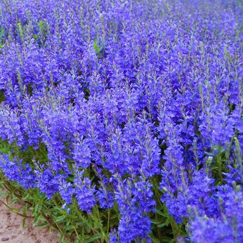 Цветение начинается в июне и длится до середины июля. Цветки — мелкие, диаметром до 1 см, собраны в густые кисти длиной около 10–12 см. Цвет — интенсивно синий, без выгорания на солнце. Аромат тонкий, практически неощутимый. Соцветия придают растению вертикальный ритм, а цветовая насыщенность делает его визуально доминирующим даже при компактных размерах.