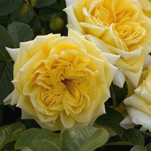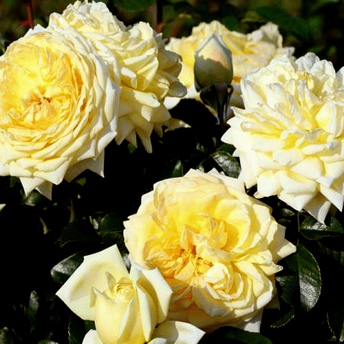 Цветы саженцев Надя Мейдиланд имеют светло-желтый цвет с белой каймой. Они очень яркие и насыщенные. Бутоны имеют форму бокала, а сами цветы шаровидной формы и крупного размера, диаметром от 10 до 12 см. Лепестков у розы Надя Мейдиланд от 95 до 98, что делает ее густомахровой. Они расположены на стебле соцветиями, по 10-12 цветков на каждом стебле.